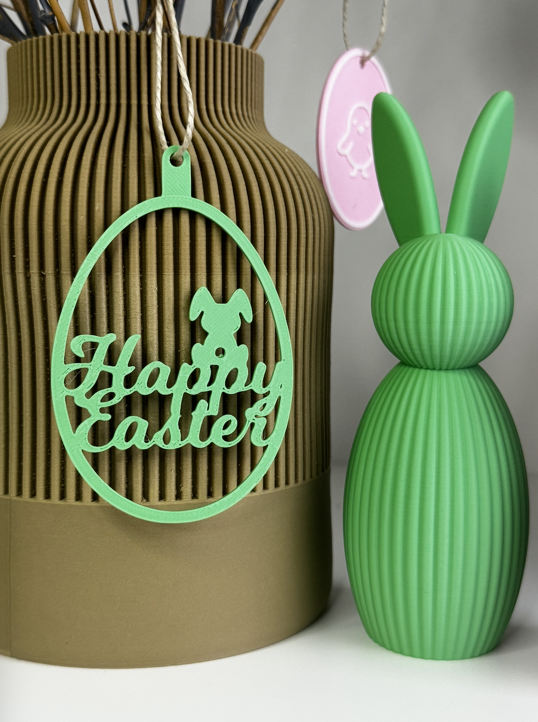 Breng een warme paassfeer in huis of zaak met deze 3D-geprinte paashanger, zorgvuldig ontworpen met fijne, uitgesneden paasfiguren en Happy Easter.