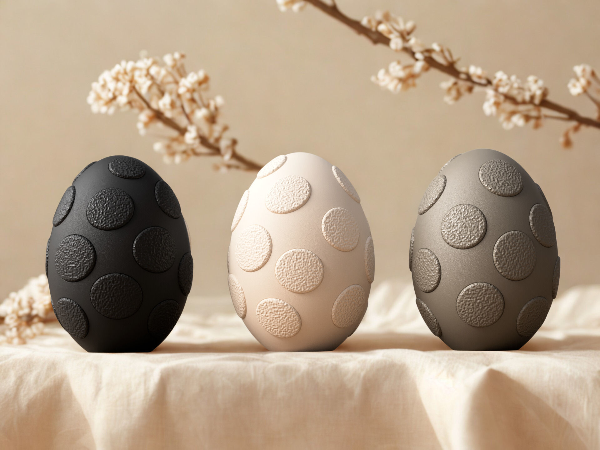 De eieren hebben een zachte matte afwerking met een subtiel relië, wat zorgt voor een moderne en verfijnde uitstraling.