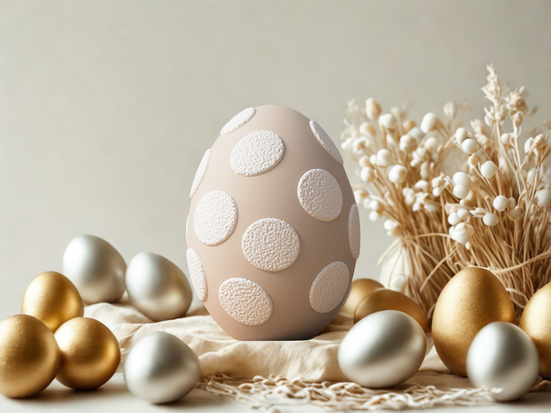 De eieren hebben een zachte matte afwerking met een subtiel reliëf van ronde stippen, wat zorgt voor een moderne en verfijnde uitstraling.