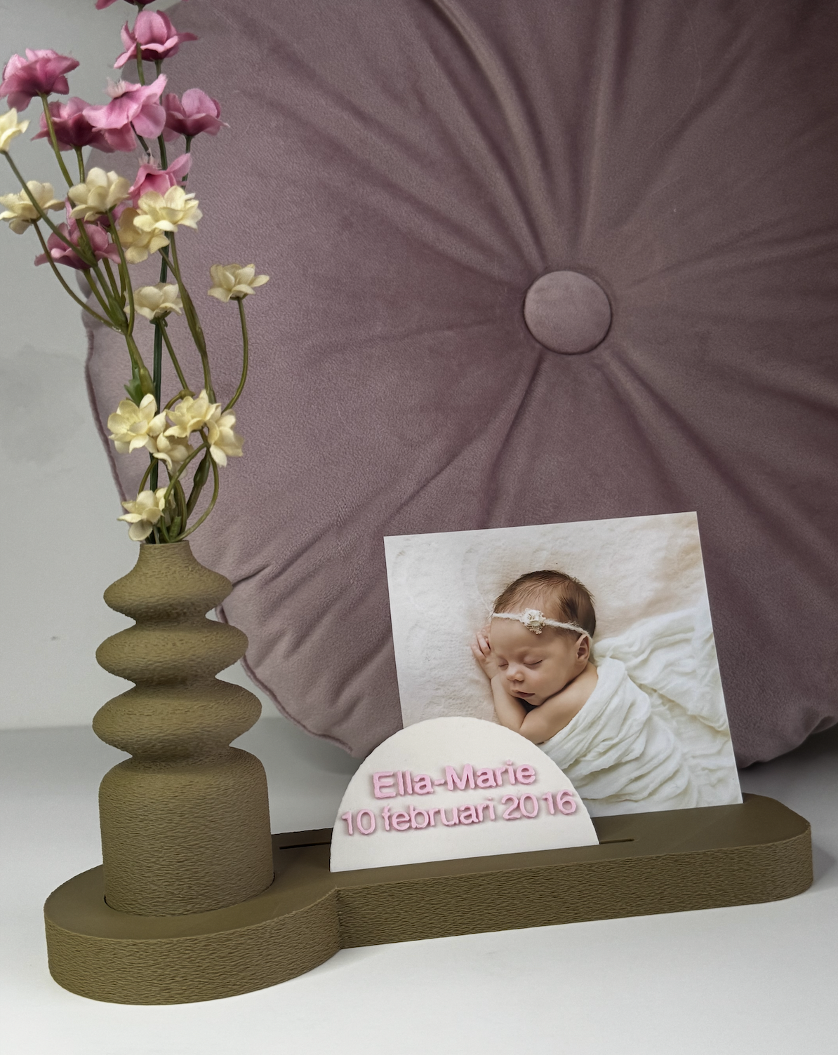 De houder biedt plaats voor een foto of kaartje en bevat een smal vaasje, ideaal voor droogbloemen. Zo combineer je beeld, tekst en natuur in één elegant geheel. Deze fotohouder wordt geleverd met een gepersonaliseerd kaartje waarop je zelf een korte tekst of boodschap kiest.